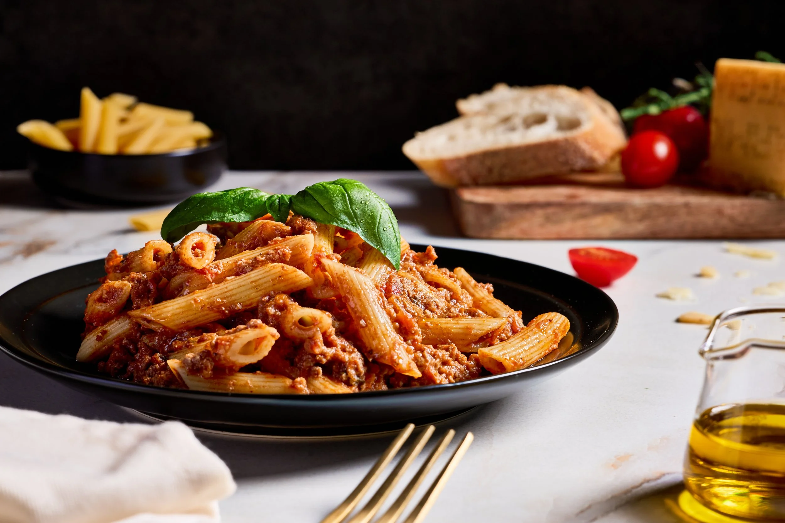 A timeless classic: Penne Bolognese - rich, slow-simmered Bolognese tossed with perfectly cooked penne.