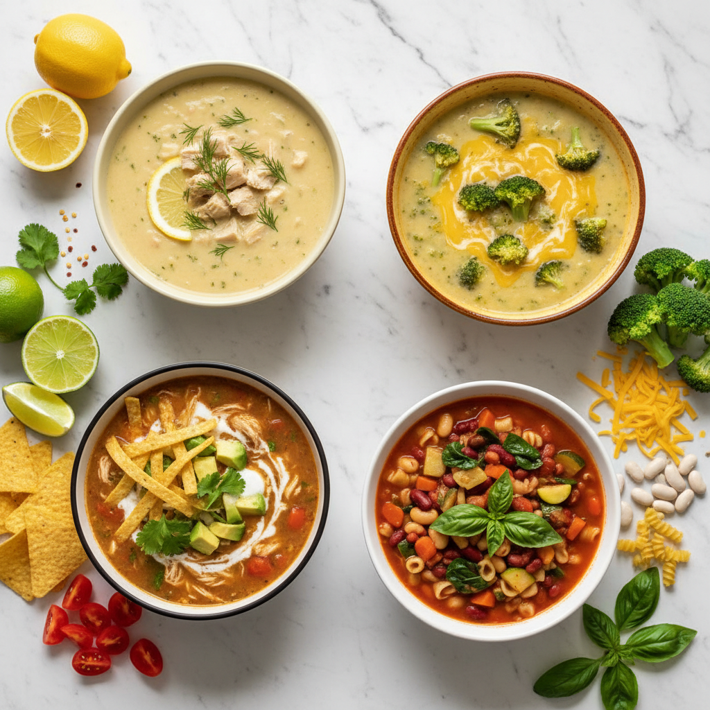 Elevated classics for cooler days: Chicken Tortilla, Lemon Chicken, Broccoli Cheddar and Vegetable Minestrone.