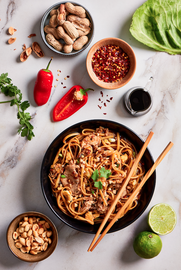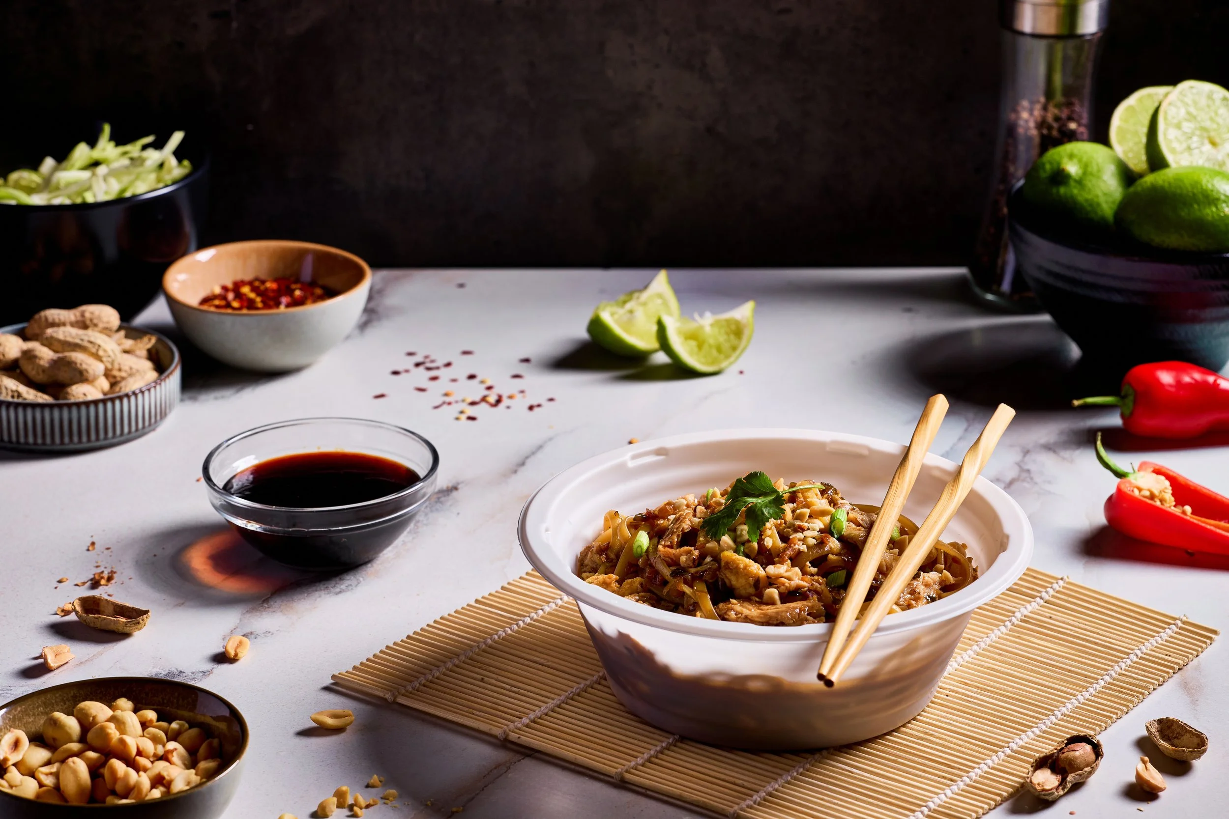 INGREDIENTS: linguine (durum wheat [niacin, iron, thiamine, riboflavin, folate]), water, chicken (chicken breast, water, salt), seasoning (brown sugar, sugar, natural flavor, paprika), bean sprouts (bean sprouts, water, salt, ascorbic acid, citric acid), scrambled eggs (whole eggs, skim milk, soybean oil, modified food starch, salt, xanthan gum, liquid pepper extract, citric acid), cabbage, carrot, fish sauce (anchovy extract, salt, water, sugar, hydrolyzed vegetable protein [corn]), olive oil, peanuts, rice vinegar (rice vinegar, water), lime juice, green onion, sriracha (red jalapeno pepper, water, sugar, salt, distilled vinegar, xanthan gum, tabasco pepper sauce [distilled vinegar, red pepper, salt]), vinegar, sweet soy sauce (sugars [coconut sugar, sugar], soy extract [water, salt, soybean, wheat], water, caramel color, salt, sodium benzoate, citric acid, xanthan gum), corn starch, garlic, cilantro, pomegranate extract