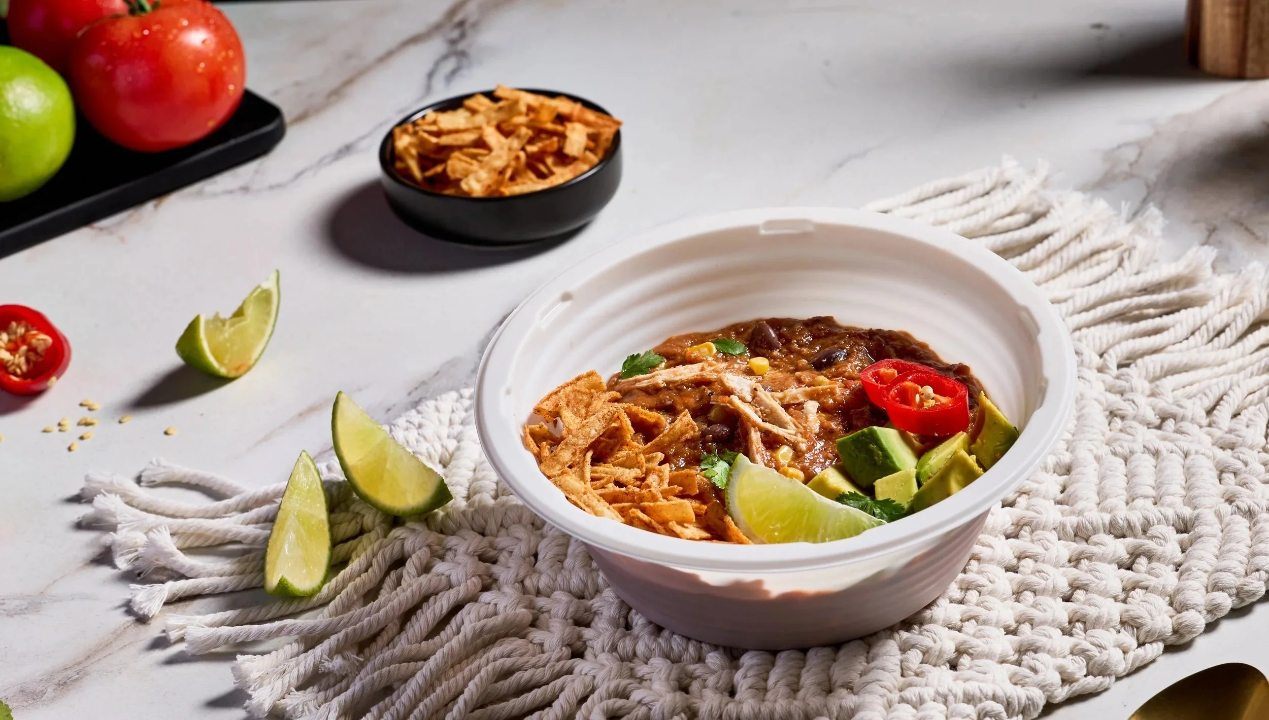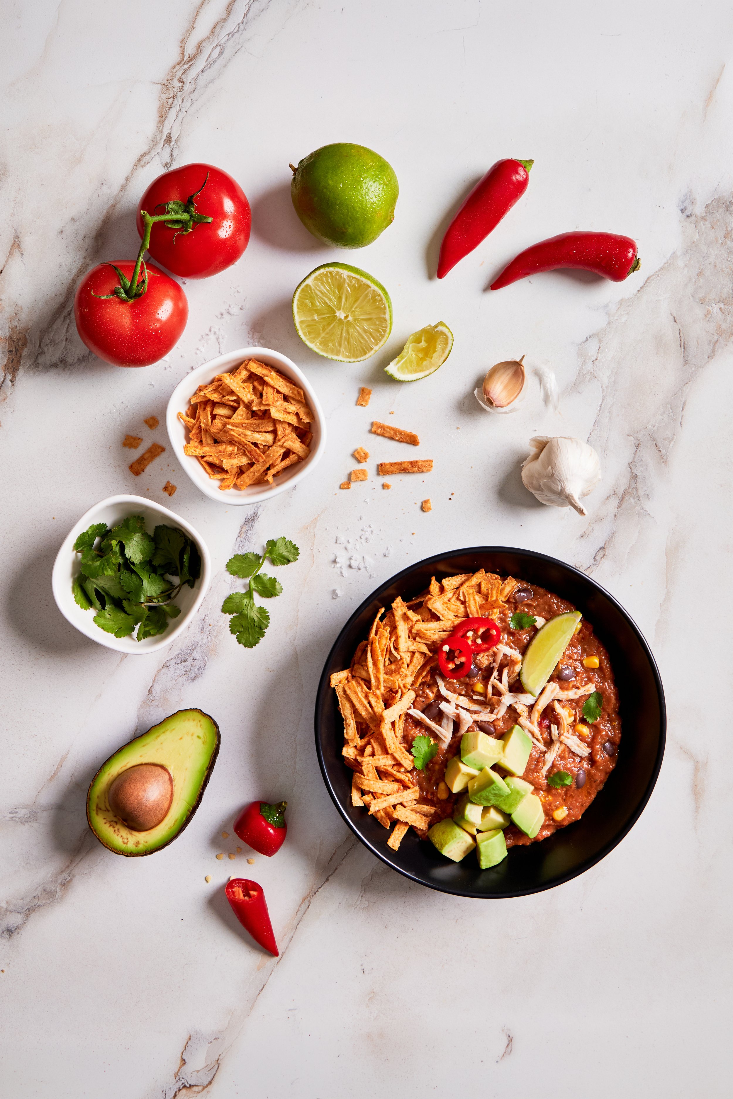 Bold and comforting chicken tortilla soup with tender sous-vide chicken, smoky chipotle, black beans, corn, and tomatoes.