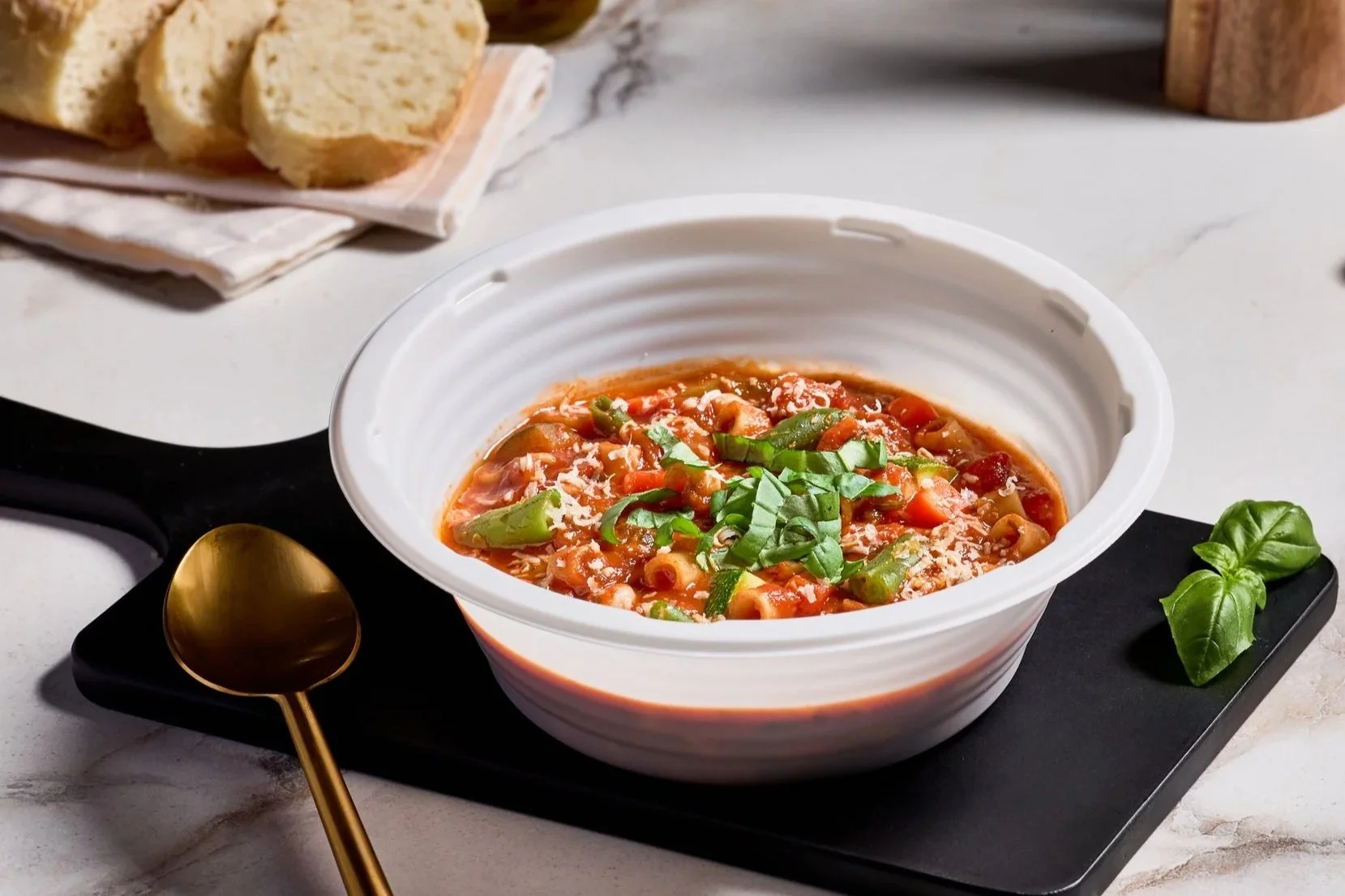 INGREDIENTS: tomato puree [tomato puree (water, tomato paste), citric acid], water, tomato (tomatoes, tomato juice, salt, calcium chloride, citric acid), zucchini, mirepoix (carrot, onion, celery), cannellini beans (white beans, water), ditalini pasta (semolina wheat flour, durum wheat flour, niacin, iron, thiamin mononitrate, riboflavin, folic acid), green beans, vegetable base [sautéed vegetable purees (onion, carrot, celery, red bell pepper), yeast extract, salt, sugar, tomato powder, natural flavors, contains 2% or less of the following: onion juice concentrate, garlic juice concentrate, shallot juice, spice, red wine concentrate, concentrated carrot juice, dehydrated carrots], olive oil, vinegar, garlic, seasoning blend (natural flavor, tomatoes), parsley, pomegranate extract, rosemary