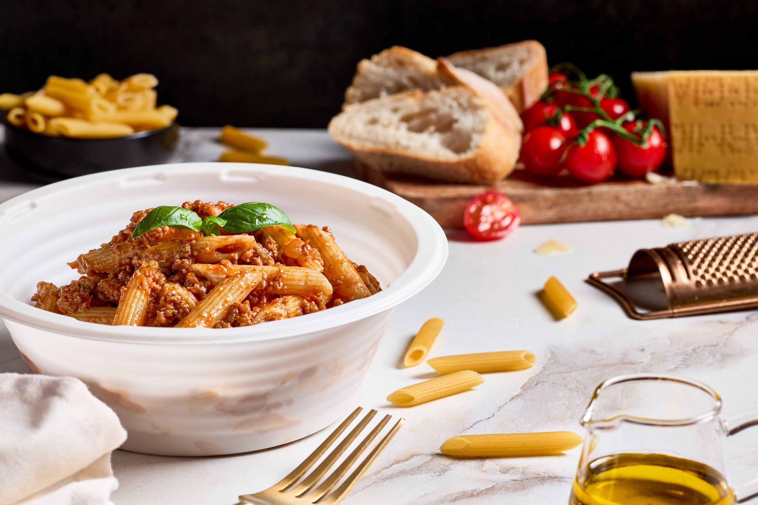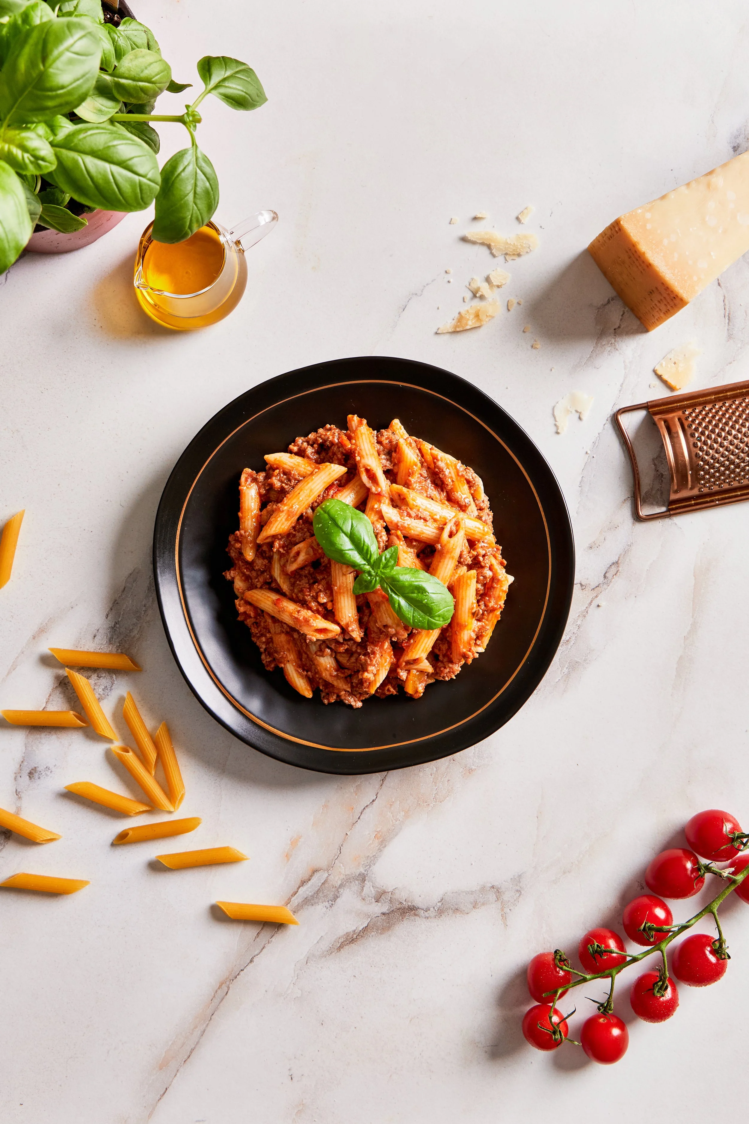 Al dente penne tossed in a slow-simmered sous-vide beef Bolognese enriched with tomatoes, red wine, and Parmesan.